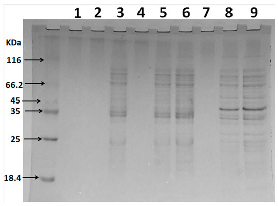 The effect of D-ESP and D-GSP on the intracellular protein leakage of ETEC-K88 based on SDS-PAGE analysis: Lanes 1–3, control groups (sterile water, 1, 3, and 5 h, respectively); Lanes 4–6, ETEC K88 treated with a 1MBC concentration of D-ESP for 1, 3, and 5 h respectively; and Lanes 7–9, ETEC K88 treated with a 1MBC concentration of D-GSP for 1, 3, and 5 h, respectively.