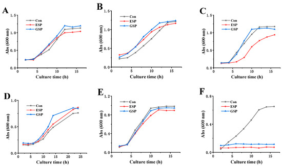 The sulfated polysaccharides (D-ESP and D-GSP) were added to the culture medium containing different microorganisms at the concentration of MBC to ETEC K88, including intestinal probiotics (Lactobacillus rhamnosus ATCC 53103, Bacillus coagulans ATCC 7050, and Bacillus subtilis CMCC 63501), S. aureus ATCC 29213, and Saccharomyces cerevisiae BY4741. After 16 h of co-culturing the polysaccharides with different microorganisms, their growth was examined at 2 h intervals by determining the absorbance of the culture medium at 600 nm.