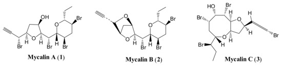 Mycalin A (1) is the most abundant metabolite isolated from the natural source. It possesses an unusual terminal bromopropargylic side chain, cis-THF (tetrahydrofuran) and cis-THP (tetrahydropyran) rings and four bromine atoms, a unique structural feature among this kind of metabolite [1]. Mycalin A has subsequently been isolated from two algae of Laurencia genus namely Laurencia paniculata [8] (‡), collected at Çeşmealt near Izmir (Turkey) and Laurencia obtusa [9] (§), collected in the Greek Ionic sea. The former organism also contained mycalin B [8] (‡) (2, Figure 1), a substance closely related to mycalin A. These findings support the hypothesis about the algal origin of the mycalins. The structural determination of compounds 1–3 was accomplished through spectral evidence and chemical correlation and derivatization work, and their relative and absolute stereochemistry was firmly established by X-ray analyses.