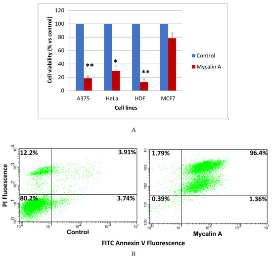 (A) Effect of mycalin A on tumor and healthy cell proliferation. The cells were incubated in the presence of 10 µM mycalin A, at 37 °C. Blue bars: control (vehicle treated cells); red bars: treated cells. Error bars represent ± SE (standard error), ** p < 0.01, * p < 0.05. (B) Apoptosis analysis with the annexin V-FITC (V-fluorescein isothiocyanate)/PI (propidium iodine) double staining method on A375 cells. The cells were treated with mycalin A (1), at 37 °C, at 10 µM concentration, for 48 h. The control is the vehicle treated sample. Lower left quadrant: viable cells; upper left: necrotic cells; upper right: advanced apoptotic cells; lower right: early apoptotic cells. This picture is representative of two independent experiments.
