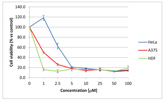 The human cervical adenocarcinoma (HeLa), human breast adenocarcinoma (MCF-7) and human malignant melanoma (A375) cell lines were from ATCC (U.S.). The normal human dermal fibroblasts (HDF) were kindly provided by Dr. Annalisa Tito (Arterra, Biosciences). The cells were grown in DMEM (Dulbecco’s Modified Eagle Medium) supplemented with 10% fetal bovine serum (FBS), 1% glutamine, 100 U/mL penicillin and 100 µg/mL streptomycin (Euroclone, Milan, Italy) and maintained in humidified air containing 5% CO2, at 37 °C.