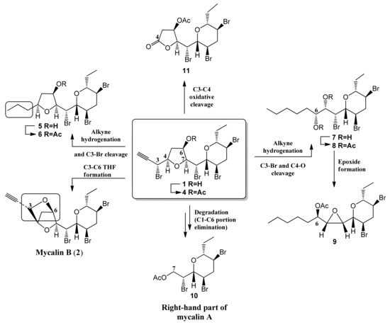 The above interesting results on the activity of mycalin A prompted us to design simplified analogues of mycalin A which could retain the antitumor activity of the parent compound while exhibiting a limited toxicity towards healthy cells. To achieve this objective, mycalin A was subjected to a modification of its functional groups and a structural simplification, including degradation. An overview of the prepared derivatives 2 and 4–11 is shown in Figure 4. A detailed explanation of the chemistry follows.
