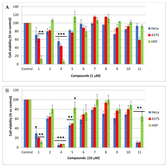 The cells were plated at a density of 1200 cells/well for A375, 1000 cells/well for HeLa and 2000 cells/well for HDF and MCF-7, in 96-well microplates (Corning). After 24 h incubation, the cells were treated with different concentrations of each of the compounds 1, 2 and 4–11, previously solubilized in DMSO (vehicle). The cell proliferation was determined after 48 h of treatment by using MTT (Sigma Aldrich, Milan, Italy) as previously reported. The plates were then analyzed by using a microplate reader (Enspire, Perkin Elmer, Cambridge, MA, USA) at 570 nm. The mean value ± SE of the adherent cells for each treatment was expressed as the relative percentage of the cell number with respect to the cells treated with the vehicle (control). Statistical differences were determined by the Student’s test, paired, two-sided. All the experiments were performed at least in triplicate and repeated at least 3 times; a p value less than 0.05 was considered to be significative. The IC50 values were obtained by the Prism 6.01 software (GraphPad San Diego, CA, U.S.) by extrapolating them from the dose–response curves data [18].