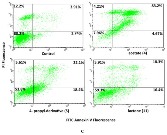Then, FITC-AnnexinV assays were performed on the A375 cell line to evaluate the ability of 4, 5, and 11 to induce cell death through apoptosis. The cell sample was treated with such compounds at a 10 µM concentration for 48 h. The results indicated that all the tested compounds induced apoptotic effects (Figure 5C). In particular, 4 showed the entire population in late apoptosis, as observed for mycalin A. Differently, 5 and 11 displayed a lower level of apoptosis, at the same concentration.