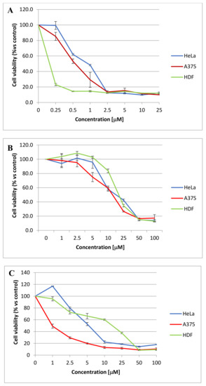 Dose-response curves of 4 (A), 5 (B), and 11 (C). The compounds were tested at different concentrations on the indicated cell lines. The proliferation was evaluated using the MTT assay. The results are presented as the percentage of proliferating cells with respect to the control (vehicle treated cells) and are expressed as means ± SE of at least three independent experiments performed in triplicate. Statistical analysis 4: on HeLa p < 0.001 from 0.5 to 25 µM, on A375 p < 0.01 from 0.5 to 25 µM, on HDF p < 0.001 from 0.25 to 25 µM. 5: on HeLa p < 0.01 from 10 to 100 µM, on A375 p < 0.01 at 10 and 25 µM, p < 0.05 at 50 and 100 µM, on HDF p < 0.05 at 10 µM and p < 0.001 from 25 to 100 µM. 11: on HeLa p < 0.01 from 2.5 to 100 µM, on A375 p < 0.05 at 2.5 µM, p < 0.01 from 5 to 100 µM, on HDF p < 0.01 at 10 µM and p < 0.05 from 25 to 100 µM.