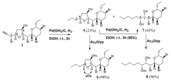 The structures of 5 and 7 were confirmed by extensive 2D NMR (two-dimensional nuclear magnetic resonance) experiments on the corresponding acetate derivatives 6 and 8, respectively, which were obtained under usual acetylation conditions (Scheme 1). The complete proton and carbon assignments of 6 and 8 are reported in Table S1 and S2, respectively. In particular, the presence of a strong nOe correlation between the H-4 and H-7 protons in 6 (Scheme 1 and Figure S12) confirmed that the cis configuration of the THF ring had been preserved under the hydrogenation conditions. On the other hand, the replacement of the methine proton signal resonating at δ 3.96 (H-4) in 6 (Scheme 1) with the methylene signal resonating at δ 1.26 (H2-4) in 8 (Scheme 1), confirmed the cleavage of the THF ring at the C4-O bond in 1. Based on the retention of the S configuration at C7 on reductive opening of the THF ring, the 7S,8R configuration could be formulated for the 7,8-halohydrin system in 7.