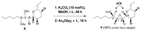 Epoxide 9 was obtained on treatment of diacetate 8 with catalytic amounts of K2CO3 in MeOH, followed by acetylation (Scheme 2). The presence of an nOe correlation between H-6 and H-9 protons in 9 (Scheme 2; see Table S3 for the complete NMR assignment), pointed to the cis configuration of the epoxide ring and, consequently, to the all syn arrangement of the C6–C8 segment in 8. Therefore, we could assign the 6R,7S,8S configuration at the C6–C8 stereocentres in 9.