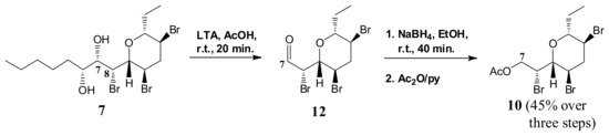Acetylation of the above alcohol with Ac2O/pyridine (0.5 mL/0.5 mL) overnight afforded 4.0 mg of the acetyl derivative 10. Filtration of this material on a short pad of silica gel (eluent: n-hexane-EtOAc, 9:1), gave pure acetate 10 (2.8 mg, 45% over three steps) as a colorless oil. 10: = +18.2 (c = 0.19, CHCl3). IR (neat) λmax 1746, 1227 cm−1. 1H-NMR: (700 MHz, CDCl3): δ 4.60 (ddd, J = 8.3, 6.7, 1.8, 1H), 4.43 (dd, J = 11.3, 6.7, 1H), 4.40 (dd, J = 11.3, 8.3, 1H), 4.10 (ddd, J = 12.1, 9.7, 4.5, 1H), 3.75 (ddd, J = 12.0, 10.0, 4.3, 1H), 3.51 (dd, J = 9.7, 1.8, 1H), 3.43 (ddd, J = 10.0, 8.5, 2.5, 1H), 3.01 (ddd, J = 12.1, 4.5, 4.3, 1H), 2.46 (ddd, J = 12.9, 12.1, 12.0, 1H), 2.11 (s, 3H, acetate), 2.03 (ddq, 14.5, 7.4, 2.5 1H), 1.55 (ddq, J = 14.5, 8.5, 7.4, 1H), 0.96 (t, J = 7.4, 3H). 13C-NMR: (176 MHz, CDCl3): δ 170.2, 83.7, 79.3, 64.7, 49.9, 47.5, 46.6, 45.3, 25.8, 20.7, 9.4. HRESIMS m/z: calcd for C11H1779Br3NaO3 456.8626 [M + Na]+, found: 456.8629.