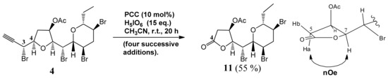 Lastly, lactone 11 was prepared by using a PCC (pyridinium chlorochromate)-catalyzed process (PCC/H5IO6 system) recently discovered in our laboratory [16], starting from mycalin A acetate (Scheme 5). Okamura et al. [17] have postulated that the actual oxidizing agent, under the above conditions, is chlorochromateperiodate (CCP), an oxidizing species more powerful than PCC, derived from the condensation of PCC and H5IO6 with the elimination of water. As we observed for the preparation of the corresponding benzoate [12], this process failed to go to completion under previously used conditions. However, in this instance we were able to force the process up to the complete consumption of the starting material by means of three further additions of freshly prepared CCP. In this way, lactone 11 was obtained in a 55% isolated yield. The loss of the C1-C3 carbon chain and the formation of the lactone ring was confirmed by 13C-NMR (Figure S34) and HMBC (Figure S38) spectra. An nOe correlation between Ha-5 and H-7 protons in 11 further confirmed the configuration at C-7 (Scheme 5 right and Figure S36). Due to the limited amount of mycalin A, no further optimization of the process could be carried out at this stage. However, the observed behavior suggests a quick destruction of the active species and this process is certainly worth further investigation. Considering the synthetic importance of γ-lactones and the biological activity displayed by a variety of natural substances belonging to this class of compound, further studies are currently in progress in our laboratories.