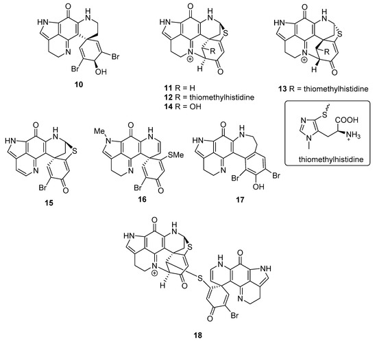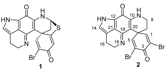 - Hu, J.-F.; Fan, H.; Xiong, J.; Wu, S.-B. Discorhabdins and Pyrroloiminoquinone-Related Alkaloids. Chem. Rev. 2011, 111, 5465–5491. [Google Scholar] [CrossRef] [PubMed]