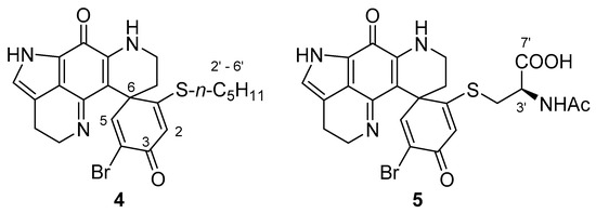 Structures of the 1-pentanethiol 4 and N-acetyl-l-cysteine adducts 5 of discorhabdin C.