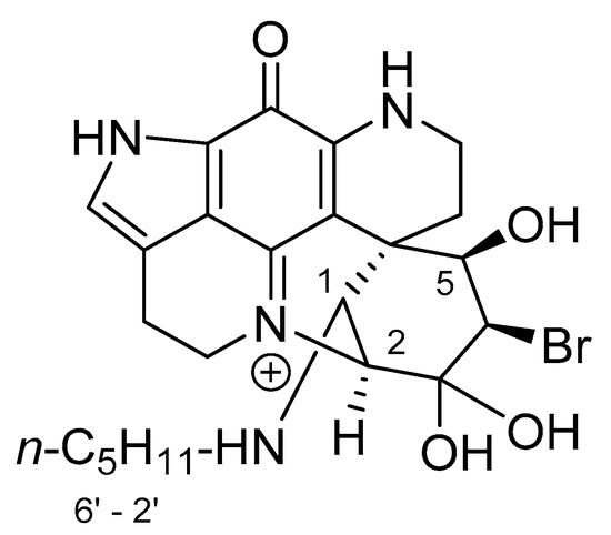 The absence of olefinic resonances due to H-1/5 identified the site of reaction to be localised at the spiro-dienone ring, while the change in appearance of both sets of methylene resonances H2-16 and H2-17 from clearly defined triplets (in discorhabdin C) [4] to diastereotopic multiplets suggested that the alkaloid had undergone ring closure between N-18 and C-2 [18,19]. The presence of two alkyl methines [δH 4.28 (d, J = 2.3 Hz), δC 55.3 (CH-1); δH 4.38 (d, J = 2.3 Hz), δC 66.7 (CH-2)] and the observation of an HMBC correlation between H-2 and C-19 (δC 154.2) further supported N-18 to C-2 ring closure. An HMBC correlation between the pentylamine H2-2′ resonance (δH 3.19) and the carbon resonance at δC 55.3 located the amine substituent at C-1. This sequence of analysis left two protons (δH 4.42 and 4.15) and three 13C resonances (δC 98.0, 75.8 and 57.5) unassigned. HSQC correlations established the resonances to be composed of two methines (δH 4.42, δC 57.5; δH 4.15, δC 75.8) and a quaternary carbon (δC 98.0), with a weak COSY correlation between the two protons identifying them to be part of an isolated spin-system. HMBC correlations observed for H-1 (to δC 41.6 (C-6)), H-2 (to δC 41.6 (C-6), 55.6 (C-1), 57.5 (C-4) and 98.0 (C-3)) and δH 4.15 (H-5) (to δC 41.6 (C-6), 55.6 (C-1), 57.5 (C-4) and 98.0 (C-3)) established the C-1 to C-6 spiro-ring to be entirely composed of sp3-hydridised carbons, with C-3 (δC 98.0) being especially deshielded. It was interesting to note that over a period of days of being stored in D2O NMR solvent, the signals for H-4 (δH 4.42) and C-4 (δC 57.5) would reduce in intensity, eventually disappearing from spectra. We suspected 2H incorporation into 6 from the D2O NMR solvent, with its attendant deuterium quadrupole relaxation, spin-spin splitting and reduced Overhauser enhancement [20], being the reasons for the loss of H-4/C-4 NMR signals. Subsequent drying of the NMR sample, followed by three cycles of dissolution in H2O and lyophilisation then rapid re-acquisition of NMR data in either D2O or H2O:D2O (9:1) restored the presence of the signals. The ESI-mass spectrum of the reaction product identified a dominant ion cluster at m/z 505/507, which under high resolution analysis corresponded to a molecular formula of C23H30BrN4O4. This formula suggested 6 was composed of a mono-debrominated discorhabdin C core bearing one aminopentane moiety and two mole equivalents of H2O. Additional fragment ions were observed at m/z 487/489 (M-H2O) and m/z 469/471 (M-2H2O), confirming the reaction product contained two moles of H2O that were readily expelled under ESIMS conditions. ESIMS analysis of a sample dissolved in MeOH-H2O identified an additional ion cluster at m/z 519/521 (M-H2O+CH3OH) suggesting solvent exchange with methanol was also facile. The combination of NMR chemical shifts and ESIMS data identified C-3 to be present as an acetal (δC 98.0) and C-5 (δC 75.8) was a secondary alcohol. We thus concluded the structure of the product resulting from reaction of discorhabdin C with 1-aminopentane was 6 (Figure 4).