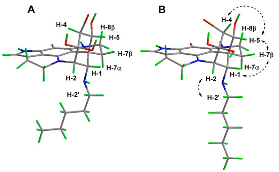 With respect to the relative stereochemistry of the product, it should be noted that the geometry resulting from ring closure between N-18 and C-2 of the discorhabdin scaffold automatically defines positions C-2 and C-6 as being 2S*,6R* (Figure 5A,B). The configuration at positions 1 and 5 were defined by the observation of NOESY correlations between each of H-1 (δH 4.28) and H-5 (δH 4.15) and the more downfield [16,19] of the diastereotopic methylene H2-7 protons [H-7β (δH 2.53)], and from H-5 to one of the diastereotopic H2-8 protons (H-8β, δH 3.62) giving configurations of 1S* and 5R*. Additional support for the syn-relationship between these three protons came from examination of the relative intensities of HMBC correlations observed in an experiment optimised for xJCH 8.33 Hz. Of the two diastereotopic H2-7 methylene protons, δH 2.53 and 1.74, only the former exhibited a three-bond correlation to C-20, supporting an antiperiplanar relationship between H-7β δH 2.53 and C-20 [19]. The H-1 resonance (δH 4.28) also exhibited a strong HMBC correlation to C-20, supporting their antiperiplanar relationship. Assigning the final stereogenic centre (C-4) made use of a combination of molecular modelling, J analysis and NOESY data. Conformer searching using PCModel (v 10, Serena Software) identified the dominant (chair) conformers of the two diastereomers 1S*,2S*,4S*,5R*,6R*-6 (Figure 5A) and 1S*,2S*,4R*,5R*,6R*-6 (Figure 5B). The observation of a small magnitude JH-4/H-5 coupling constant (JHH = 3.4 Hz) and a NOESY correlation between the two protons was supported by model B, establishing a relative configuration of 4R*.