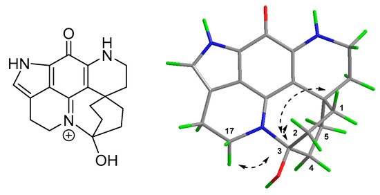 Collectively these studies characterise the electrophilic reactivity of the spiro-dienone moiety of discorhabdin C, a structural feature that is known to be a factor, but not the sole determinant, for the cytotoxicity reported for this class of alkaloid [15,16,17]. To further explore the degree of essentiality of the dienone ring towards cytotoxicity, discorhabdin C was subjected to hydrogenation using Pd/C under an H2 atmosphere for 15 min to afford, after workup, a blue-coloured product in 71% yield. HR ESI mass spectrometry determined a formula of C18H20N3O2 ([M] + 310.1542, calcd. 310.1550) indicating didebromination and addition of two moles of H2. Direct comparison with 1H NMR data observed for discorhabdin C [4] identified the absence of H-1/5 olefinic resonances, a downfield shift for H2-17 (Δδ +0.38), upfield shifts for H2-8 (Δδ –0.24), and H2-7 (Δδ –0.41) and the presence of two new signals at 2.28–2.14 (m) and 1.85, with the latter two signals integrating for 4H each (Table 3). Comparison of 13C and HSQC 2D NMR data revealed the absence of resonances associated with the dienone moiety of 2 and the presence of new signals attributable to two chemically equivalent methylenes (δH 2.28–2.14, δC 35.9; δH 1.85, δC33.8) and a deshielded 13C quaternary resonance at δC 92.0. HMBC correlations from H2-1/5 (δH 1.85), H2-2/4 (δH 2.28-2.14) and H2-17 (δH 4.15) to the resonance at δC 92.0 located the carbon at C-3 and also established ring closure between C-3 and N-18. In this manner the structure of the reaction product was concluded to be the cyclic carbinolamine 7 (Figure 6).