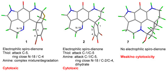 Summary of electrophilic reactivity/cytotoxicity observed for discorhabdin B (1) [16] and discorhabdin C (2) and cyclic carbinolamine derivative (7) (present study).