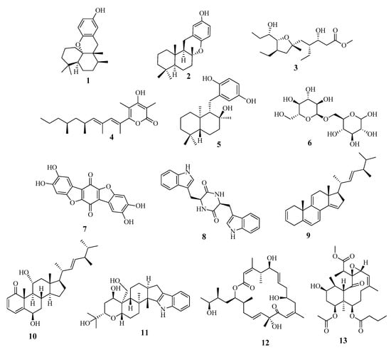 According to the literature, the majority of the identified secondary metabolites displayed cytotoxic and anticancer effects. For instance, Aureol in vitro cytotoxic activities were tested against human liver carcinoma (Hepa59T/VGH), human oral epidermoid carcinoma (KB), and human cervical epithelioid carcinoma (Hela) tumor cell lines and it showed promising cytotoxic activities. [27]. Assays on cytotoxic activity were performed for epichromazonarol against P-388, A-549, HT-29, and MEL-28 cells, and in all cases an IC50 = 15.9 μM was obtained for epichromazonarol [28], while Plakortether E was evaluated for cytotoxic activity against two different cell lines: WEHI 164 (murine fibrosarcoma) and RAW 264-7 (murine macrophage). Plakortether E proved to be selectively active against the second cell line [29]. Moreover, stoloniferone O, imposed significant antitumoral effects on HT-29 and P-388 cell lines [30]. Furthermore, the antiangiogenesis activity of thelephoric acid was reported, as it was evaluated using a tyrosine kinase assay kit with recombinant human VEGFR2. Since VEGFR2, a principal regulator of angiogenesis, is highly expressed in umbilical vein endothelial cells, thelephoric acid was examined on cell growth of HUVECs by a WST-8 assay. As a result, it exhibited antiproliferative activity in HUVECs. It also markedly inhibited cell invasion [31]. In addition, terpendole F inhibited cholesterol acyl-transferase (ACAT), a crucial enzyme in cancer progression [32].
