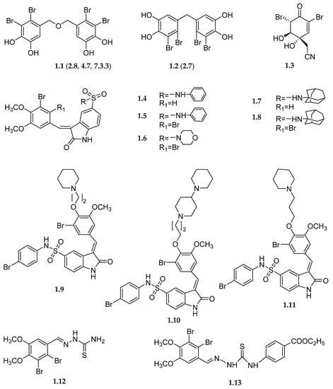 | 1.1 | 13.9 (K562), µg/mL | Bis(2,3-dibromo-4,5-dihydroxybenzyl)ether [50] |