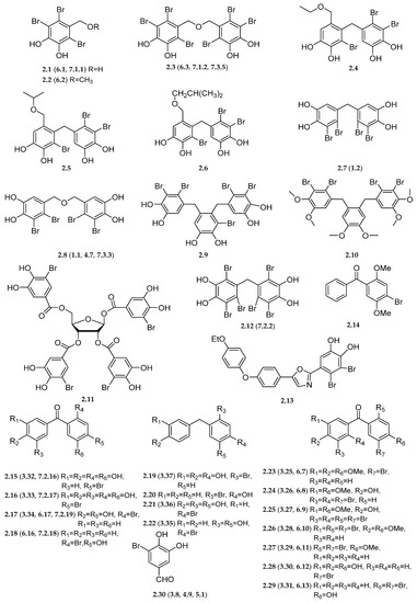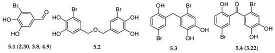 | 2.6 | 1.50 (a) | 3,4-dibromo-5-(2-bromo-3,4-dihydroxy-6-(isobutoxymethyl)benzyl)benzene-1,2-diol [69] |