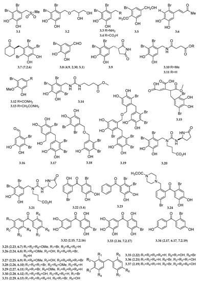 | 3.36 | 13.86 (a), 5.08 (b), µg/mL | 2-bromo-5-(4-hydroxybenzyl)benzene-1,4-diol [96] |