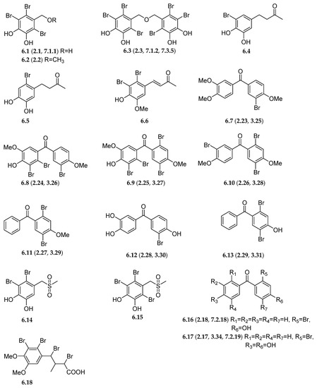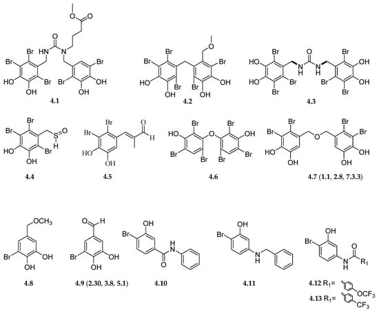 | 4.2 | MIC 12.5 µg/mL (a) | 2,5-dibromo-3,4-dihydroxy-6-(2,3,6-tribromo-4,5-dihydroxybenzyl)benzyl methyl ether [5] |