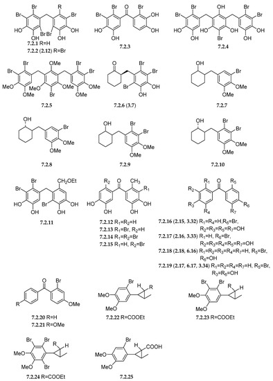 | 7.2.1 | 86.4 (a), IC50 | 3,4,6-tribromo-5-(2,5-dibromo-3,4-dihydroxybenzyl)benzene-1,2-diol [115] |