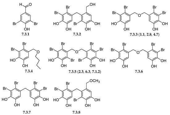 | 7.3.8 | 0.53 ± 0.18 (a) | 3,4-dibromo-5-(2-bromo-3,4-dihydroxy-6-(methoxymethyl)benzyl)benzene-1,2-diol [118] |