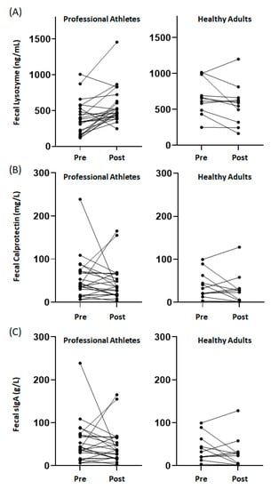 Patterns of individual response in (A) fecal lysozyme, (B) fecal calprotectin, and (C) fecal sIgA before (pre-) and after (post-) seven days of fucoidan in professional athletes and healthy adults.