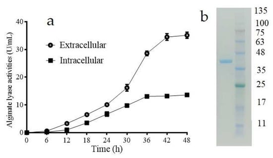 As mentioned in our previous study, Vibrio sp. W2 was screened from the viscera of abalone using alginate as the sole carbon source at 25 °C [13]. During the 48 h fermentation in ASC liquid medium at 25 °C, alginate lyase activity was observed in culture supernatants, while no alginate-degrading activity was detcted in the collected intact cells. To check the existence of intracellular alginate lyase, the cells were broken by ultrasonic degradation in phosphate buffer solution (50 mM, pH 7.0) as much as supernatants in volume. After centrifugation, the intracellular alginate lyase was present in the supernatant. As is shown in Figure 1a, the intracellular alginate lyase activity achieved 13.6 U/mL at flask level, while the supernatant contained 35.12 U/mL of the extracellular alginate lyase activity after 48 h cultivation. At 48 h, the specific activities of extracellular alginate lyase and intracellular alginate lyase were 78.7 and 126.4 U/mg. Thus, the intracellular alginate lyase was confirmed, and concerning the endogenous synthesis, the performance of this intracellular alginate lyase was relatively satisfactory.