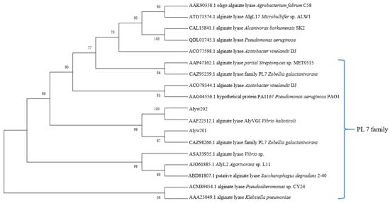 Neighbor-joining phylogenetic tree generated based on the amino acid sequences of Alyw202 and other reported alginate lyases.
