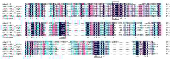Multiple sequence alignments of Alyw202 and other five well-characterized alginate lyases from the PL7 family by using DNAMAN 6.0. The conserved domains are marked in the black box.