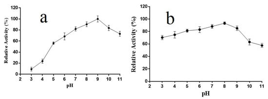 Effect of different pH on the relative activity of Alyw202. (a) Optimal pH of Alyw202; (b) Effect of different pH on stability of Alyw202. Data are given as mean ± standard deviation, n = 3.