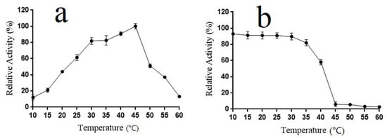 The effects of pH on the recombinant enzyme activity were performed by incubating the purified enzyme in buffers (Na2HPO4-citric acid (pH 3.0–8.0), glycine-NaOH (pH 8.5–11.0)) under the assay conditions described before [13]. The pH stability depended on the residual activity after incubating at 4 °C in buffers with different pH (3.0–11.0) for 12 h. Meanwhile, the effects of temperature (10–60 °C) on the purified recombinant enzyme were measured at pH 8.0 to determine the optimal temperature. The thermal stability was determined by the remaining activity measured at 45 °C after incubating at temperatures ranging 10 to 60 °C for 12 h. All reactions were performed in triplicate.