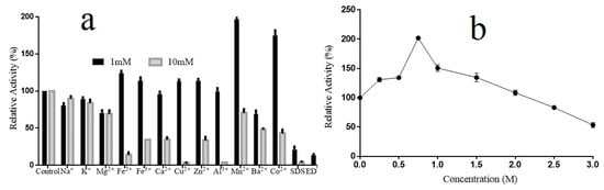 The effects of metal ions, EDTA and SDS on the activity of Alyw202 were determined at the concentrations of 1 and 10 mM separately (Figure 6a). At the concentration of 1 mM, Mn2+ and Co2+ significantly enhanced the activity by 196.8% or 175.1%, and Fe2+, Fe3+, Cu2+ and Zn2+ slightly increased the activity, while Na+, Mg2+ and Ba2+ showed slight inhibitory effects. However, with the presence of EDTA and SDS at the concentration of 1 mM the relative activity was significantly reduced. By contrast, at the concentration of 10 mM, almost all the metal ions, EDTA and SDS notably inhibited lyase activity, except Na+, K+, Mn2+ and Mg2+, which partially inhibited relative activity by 89.8%, 83.9%, 70.7% and 69.3%, respectively. Thus, the intracellular Alyw202 showed remarkable metal ion tolerance, and a moderate amount of Mn2+ can be applied to boost reaction at low temperature.