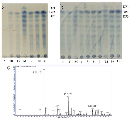 Alginate solution was hydrolyzed by Alyw202 for 40 min at pH 7.0 and 45 °C, and the degraded products were detected by TLC every 5 min. The degraded products at pH 4.0–11.0 were also detected. First, the products were analyzed with a solvent system (1-butanol/acetic acid/water 2:1:1, v/v/v) using a TLC plate (TLC silica gel 60 F254, Merck KGaA, Darmstadt, Germany). After spraying with sulfuric acid/ethanol reagent (1:4, v/v), the TLC plate was heated at 80 °C for 30 min to visualize the spots. To further determine the composition and degree of polymerization (DP), the degraded products pH 7.0 were desalted and investigated by ESI-MS after incubation at 45 °C for 40 min. The handling method was same as that of the previous study [13].