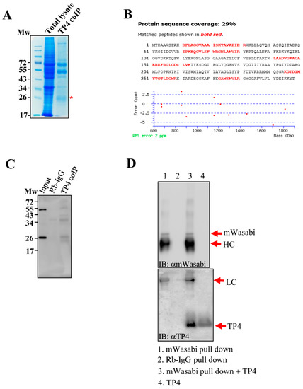 Immunoprecipitation (IP) with the TP4 antibody was performed as previously described [10]. Briefly, cell lysates were first prepared in IP detergent (50 mM Tris-HCl, pH 8.0; 150 mM NaCl; 1% Igepal CA-630 (Sigma-Aldrich, St. Louis, MO, USA); protease cocktail (Roche Applied Science, Mannheim, Germany)). One milligram of protein lysate from TP4-treated A549 cells (10 µg/mL, 3 h) was incubated with primary antibody and magnetic Dynabeads (DynabeadsTM, Thermo Fisher Scientific, Oslo, Norway). For the LC-MS/MS analysis, boiled lysates were electrophoresed on a 12% SDS-PAGE and stained by InstantBlueTM dye (Expedeon Ltd., Cambridgeshire, UK). A protein band was excised and was processed for tryptic in-gel digestion and LC-MS/MS analysis (Q-Exactive LC-MS, Thermo Scientific). Data acquired from the MS were analyzed by Mascot engine (v.2.6.0). For the pulldown assay using the mWasabi antibody, transfected cells were harvested by IP detergent. One milligram protein lysate was then incubated with mWasabi antibody and magnetic Dynabeads. Eluted protein samples from the beads were then incubated with 10 µg of TP4 overnight at 4 °C. For Western blotting, boiled samples were electrophoresed on an 8% or 15% SDS-PAGE and transferred onto polyvinylidene fluoride (PVDF) membrane. The membranes were blocked for 1 h at room temperature (RT), and incubated with primary and secondary antibodies. Membranes were visualized with enhanced chemiluminescence (Immobilon Western Chemiluminescent HRP substrate, Merck Millipore, Billerica, MA, USA) and detected with a UVP BioSpectrumTM 500 imaging system (Analytik Jena AG, Thuringia, Germany).