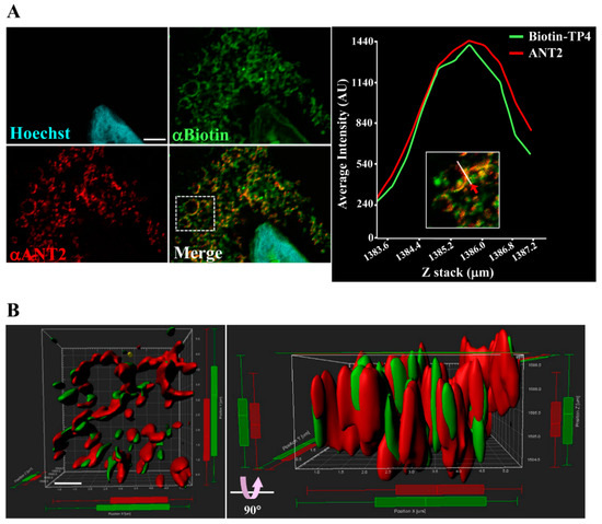 To further examine the interaction between TP4 and ANT2, as well as their spatial association, colocalization was determined by super-resolution confocal microscopy (Figure 2A, left panel) and quantified with a line-series intensity correlation (Figure 2A, right panel). The three-dimensional (3D) deconvoluted confocal microscopy image was processed for 3D modeling with Imaris software and showed a pattern of TP4-mitochondrial integration (Figure 2B).
