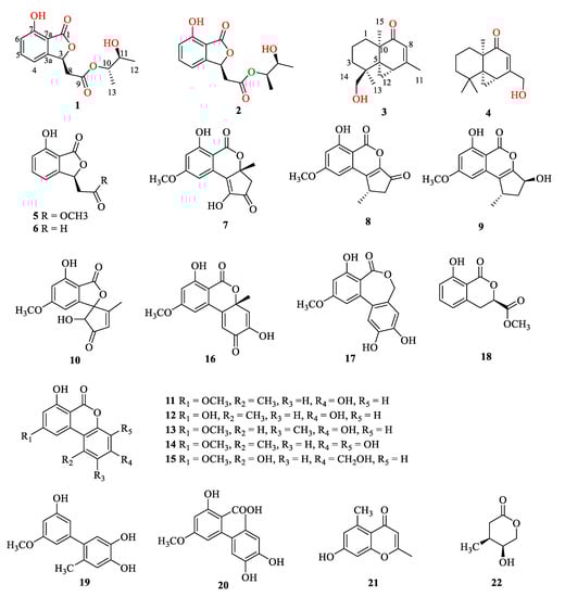 - Wang, Q.-X.; Bao, L.; Yang, X.-L.; Guo, H.; Yang, R.-N.; Ren, B.; Zhang, L.-X.; Dai, H.-Q.; Guo, L.-D.; Liu, H.-W. Polyketides with antimicrobial activity from the solid culture of an endolichenic fungus Ulocladium sp. Fitoterapia 2012, 83, 209–214. [Google Scholar] [CrossRef] [PubMed]