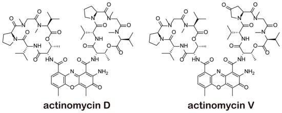 - Goldberg, I.H.; Rabinowicz, M.; Reich, E. Basis of actinomycin action, I. dna binding and inhibition of rna-polymerase synthetic reactions by actinomycin. Proc. Natl. Acad. Sci. USA 1962, 48, 2094–2101. [Google Scholar] [CrossRef]