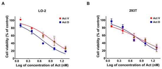 The cells were treated with serial concentrations of Act V and Act D (0–0.02 μM) for 48 h, and the IC50s were determined (Act D, which has been used for a long time in clinic, serves as a positive control here), as shown in Table 1 and our previous study [,]. Act V exhibited considerably stronger efficacy against cancer cells with a ten-fold lower IC50 value compared to Act D. Act V and Act D induced cytotoxicity in human normal liver LO-2 and human embryonic kidney 293T cell lines in a concentration-dependent manner (Figure 2).