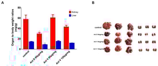 Effect of actinomycins on organ to body weight ratios and liver and kidney size. (A) Organ weights were collected and normalized to terminal body weights for the kidney and liver. Significant differences compared to control are indicated as follows: * p < 0.05; ** p < 0.01. (B) The livers and kidneys of mice were taken out after dissection for observation.