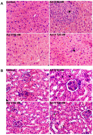 2.3. Effect of Act V and Act D on Liver and Kidney Histopathology