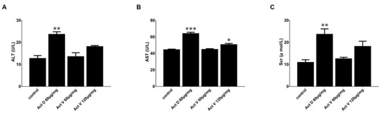 Liver and kidney biochemical indicators in serum after actinomycin administration. Hepatic biochemical indicators: (A) alanine aminotransferase (ALT); (B) aspartate aminotransferase (AST), renal biochemical indicator; (C) serum creatinine. Significant differences compared to control are indicated as follows: * p < 0.05; ** p < 0.01; *** p < 0.001.