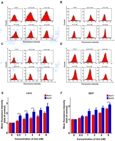 The 2′,7′-dichlorodihydrofluorescein diacetate (DCFH-DA) probe can be hydrolyzed by cellular enzymes to form DCFH. This substance can react with ROS to produce fluorescent DCF, so the DCFH-DA probe was used to estimate intracellular ROS production via flow cytometry. As shown in Figure 6, LO-2 and 293T cells treated with Act V and Act D demonstrated a dose-dependent increase in ROS production compared to the control group.