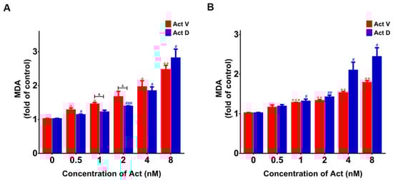 Actinomycin-induced lipid oxidation. Results obtained by assessing malondialdehyde (MDA) levels. (A) Actinomycin-induced lipid oxidation in LO-2 cells showed multiple increases compared with the control group. (B) Actinomycin-induced lipid oxidation in 293T cells showed multiple increases compared with the control group. Experiments were repeated three times: * p < 0.05; ** p < 0.01; *** p < 0.001 vs. Act V 0 nM; # p < 0.05; ## p < 0.01; ### p < 0.001 vs. Act D 0 nM; △ p < 0.05 vs. Act D.