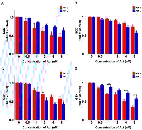 Act D down-regulated superoxide dismutase (SOD) and glutathione (GSH) levels. Results obtained using SOD and GSH kits. (A) Compared with the control group, actinomycin reduced SOD in LO-2 cells. (B) Compared with the control group, actinomycin reduced SOD in 293T cells. (C) Compared with the control group, actinomycin reduced GSH in LO-2 cells. (D) Compared with the control group, actinomycin reduced GSH in 293T cells. Experiments were repeated three times: * p < 0.05; ** p < 0.01; *** p < 0.001 vs. Act V 0 nM; # p < 0.05; ## p < 0.01; ### p < 0.001 vs. Act D 0 nM; △ p < 0.05; △△ p < 0.01 vs. Act D.