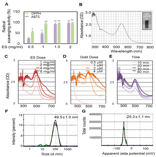 In this present study, GNPs were synthesized using the ES extract as the reductant. To determine the potential effect of the ES extract on the reduction, capsulation and stabilization of GNPs, the extracts were investigated for radical scavenging (ABTS (2,2′-Azino-bis(3-ethylbenzothiazoline-6-sulphonic acid) and DPPH (2,2-diphenyl-1-picrylhydrazyl)) activity. The results of the radical ABTS and DPPH assays revealed that the radical scavenging activity was markedly higher after treatment with the ES extract (Figure 1A). We assessed the potential of the ES extract to reduce a gold (III) chloride solution that resulted in the formation of GNPs. The addition of the ES extract to the gold (III) chloride solution at room temperature resulted in the formation of ES-GNPs, which was evident from a change in color (light-yellow to ruby red). Freshly prepared ES-GNPs in the ES extract exhibited a strong absorption at 543 nm in the UV region (Figure 1B). The optimized parameters for ES-GNPs were taken into consideration for synthesizing the ES-GNPs in a simple manner. Reaction parameters for optimizing the gold nanoparticles, such as ES extract concentration, gold(III) chloride solution concentration, and reaction times, were taken into consideration to purify the GNPs in a quick and simple manner. Therefore, a concentration of 1 mg/mL ES extracts (Figure 1C), 1 µM gold (III) chloride (Figrue 1D) and a reaction time of 20 min were chosen (Figure 1E). The resulting ES-GNPs were examined using Dynamic Light Scattering (DLS) to study their hydrodynamic size distribution, zeta potential, and polydispersity index (PDI). The hydrodynamic size distribution, zeta potential and the PDI value of the ES-GNPs were found to be 49.5 ± 1.0 nm,−25.23 ± 1.1 mV, and 0.287 ± 0.001, respectively (Figure 1F,G).