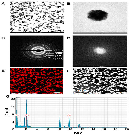 In this study the surface morphology of ES-GNPs was investigated via the HR-TEM/EDS analysis. Typical HR-TEM micrographs displayed many spherical particles, and the ES-GNPs were found to have an average diameter of 27.9 ± 4.3 nm with hexagonal-shaped morphology (Figure 2A,B). The SAED Pattern showed similar diffraction patterns which confirm the nanocrystalline nature of the ES-GNPs (Figure 2C). The FFT pattern of ES-GNPs also indicated a face-centered cubic crystal structure, which exhibited bright circular spots (lattice planes of Bragg’s reflection (111), (200), (220), and (311) planes) (Figure 2D). Figure 2E shows the representative red-particle image of the GNPs and the corresponding map for the gold (Au) atoms. The distribution of the Au atoms in the ES-GNPs was studied using High-angle annular dark-field scanning transmission electron microscopy (Figure 2F). The EDS technique represents a precise tool for analyzing the elemental composition of ES-GNPs. The results showed peak indexing of Au at 0.17 keV, 2.12 keV, and 9.81 keV; this corresponded to the results of the surface plasmon resonance analysis of the ES-GNPs that can be attributed to the presence of gold (Figure 2G). These observations suggest that it is possible to synthesize high quality ES-GNPs using our simple method.