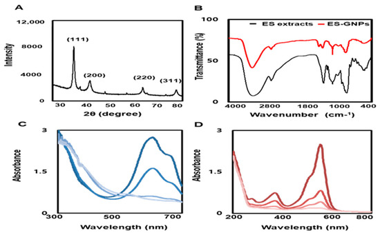 To examine the crystallization pattern of the gold atoms in the ES-GNPs, XRD measurements were recorded, as represented in Figure 3A. The main peaks were obtained at (111), (200), (220), and (311) corresponding to the Bragg’s reflections, with 2θ values (30–80°) of 37.19°, 43.35°, 66.82°, and 78.51°, respectively. The peak of the XRD spectrum confirmed that the highly purified GNPs were composed of crystalline gold. The “green” synthesis of GNPs involves biocompatible materials that can act as functionalizing ligands under physiological conditions, thereby aiding in the synthesis of GNPs that are more appropriate for biomedical applications [27]. ES extracts also provide possible functional groups that can attach to the surface of the ES-GNPs and form a cap, leading to efficient stabilization. The FT-IR spectra of the ES extracts and the corresponding ES-GNPs indicated extensive similarities. In particular, the prominent peak in ES—that corresponded to that in ES-GNPs—at 3401.81 cm−1, was related to the O–H stretch and H bonds. The peaks at 2928.15 cm−1 were attributed to the C–H stretch. Additionally, the peaks at 1262.45 cm−1 could be attributed to the C=O stretch of aromatic compounds (Figure 3B). These characteristic peaks of ES-GNPs corresponded with those in ES, indicating that the ES was successfully intercalated into the ES-GNPs. On the basis of these observations, and because of the many functional groups in the ES extract due to the presence of secondary metabolites such as phlorotannins, phenolic compounds, terpenoids, steroids, and vitamins, it was shown that our procedure could provide active sites for improving biocompatibility. The reduction of methylene blue and rhodamine B was studied using sodium borohydride in the presence of ES-GNPs, and monitored by a UV-Vis spectrophotometer. Absorption peaks corresponding to those of pure methylene blue and rhodamine B were observed at 665 nm and 555 nm, respectively. In the presence of ES-GNPs, the intensity of the deep blue (methylene blue) and pink-red (rhodamine B) colors gradually decreased and finally disappeared. In Figure 3C,D, the UV-vis spectra revealed that the peak intensity completely disappeared within 8 min of addition of ES-GNPs. Based on these data, it can be seen that we have persuasively shown that the ES extract is an important parameter for regulating the synthesis and influencing the properties of ES-GNPs.