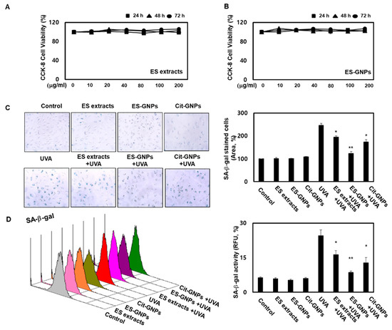 Before evaluating the potential antiphotoaging properties of ES-GNPs, cell viability was investigated using the Cell Count Kit 8 (CCK-8) assay. The results showed that the ES extract and ES-GNPs (up to 200 µg/mL) did not affect cell viability (Figure 4A,B). Therefore, in all the subsequent experiments, the cells were treated with ES extract or ES-GNPs, at doses of 100 µg/mL. The goal of our experiment was to examine the effect of ES-GNPs on the cellular senescence model that involved the induction of senescence by UVA irradiation of HDFs. As senescence-associated β-galactosidase (SA-β-galactosidase) is an important indicator of cellular senescence in models of skin photoaging, the activity of SA-β-galactosidase in the HDFs was determined. The results indicated that in comparison with the control group, the SA-β-galactosidase activity was markedly higher after UVA irradiation. However, pre-exposure with ES-GNPs remarkably reduced the SA-β-galactosidase activity (Figure 4C). We further confirmed the quantitative cellular senescence assay using flow cytometry, and found that senescence is elevated after UVA irradiation. The SA-β-galactosidase staining levels were remarkably higher in the UVA-irradiated group than in the control group. However, ES-GNPs could inhibit the increase observed in SA-β-galactosidase staining levels after UVA irradiation, indicating that ES-GNPs alleviate cellular senescence in UVA-irradiated HDFs (Figure 4D). Importantly, ES-GNPs inhibited the SA-β-galactosidase activity in HDFs to a greater extent against the background of UVA irradiation than the ES extracts. ES-GNPs also seemed to show more anti-SA-β-galactosidase activity than Cit-GNPs. These results suggest that ES-GNPs alleviate senescence in HDFs by inhibiting SA-β-galactosidase activity.