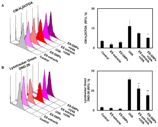 ES-GNPs inhibited the ROS production and lysosome content in UVA-irradiated human dermal fibroblasts. (A) The ROS generation was measured by flow cytometry using CM-H2DCFDA General Oxidative Stress Indicator and expressed as relative fluorescence unit (RFU). (B) The lysosome content was measured by Flow cytometry using LysoTracker Green DND-26 and expressed as relative fluorescence unit (RFU). Three independent experiments are expressed as mean ± SEM. * p < 0.05 and ** p < 0.01 compared to the UVA group. Control: untreated and unirradiated cells. ES extracts: ES extracts treated cells. ES-GNPs: ES-GNPs treated cells. UVA: UVA irradiated cells. ES extracts + UVA: ES extracts treated and then UVA irradiated cells. ES-GNPs + UVA: ES-GNPs treated and then UVA irradiated cells.